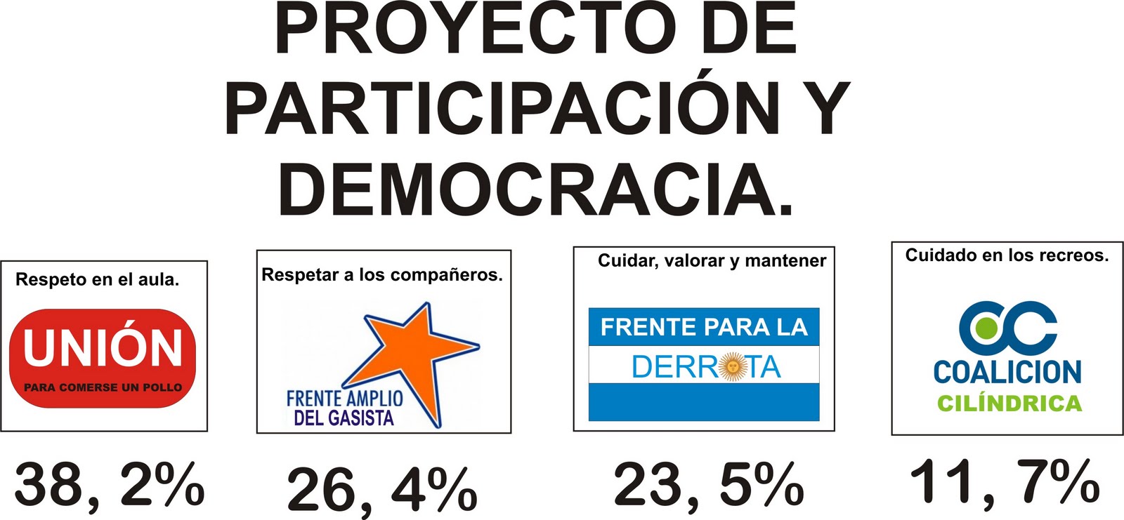 El viernes pasado, se desarrollaron las elecciones en 3ro B, donde hubo un claro ganador, la propuesta de "Unión para comerse un pollo", quienes llevaban adelante la idea del "Respeto en el aula". La misma consiste en respetarno dentro del lugar donde estudiamos, por ej: si terminamos de copiar, no distraer a los que siguen haciendolo, prestar atencion y escuchar a los compañeros y maestros. Darle una mano a quien no entiendes y recordarle a aquellos que hablan que si no hace silencio, nos perjudicamos todos.